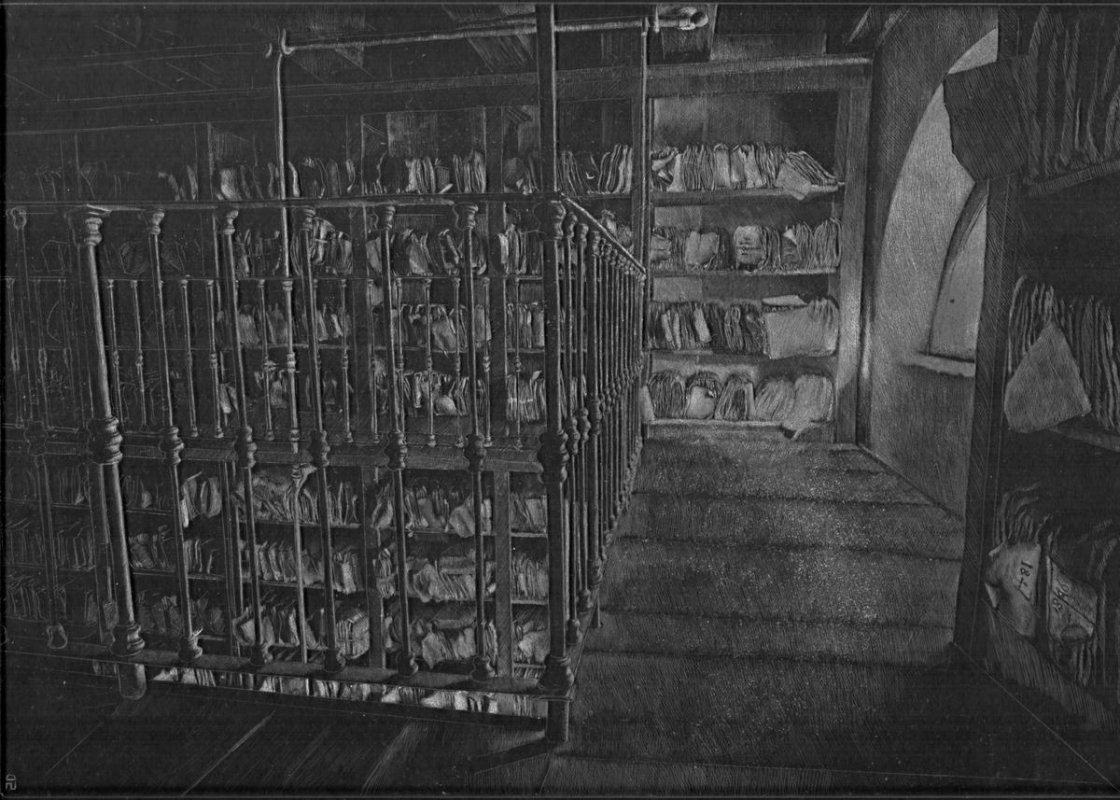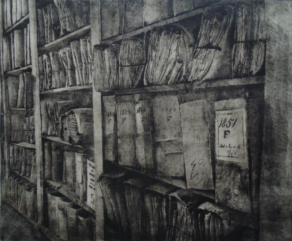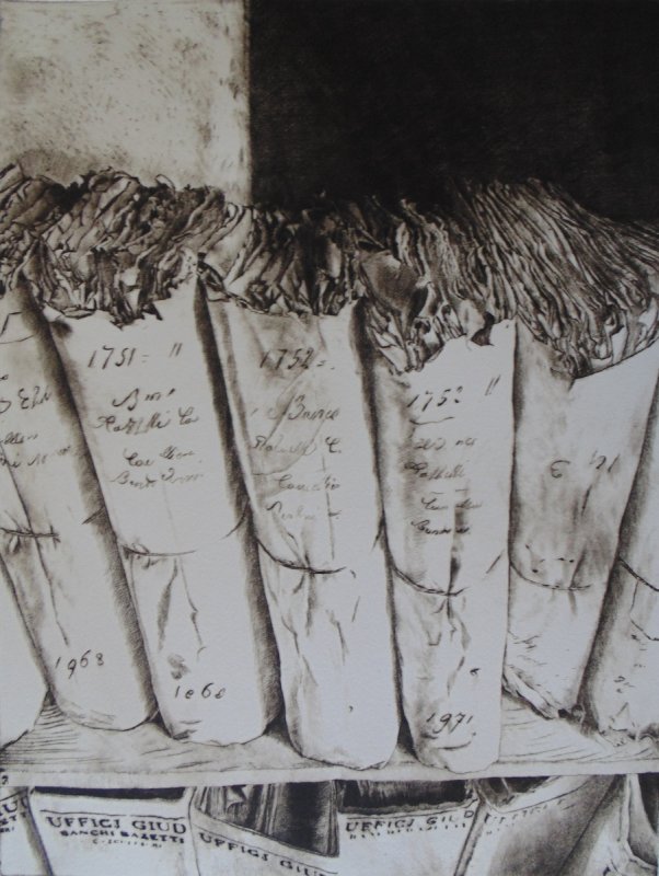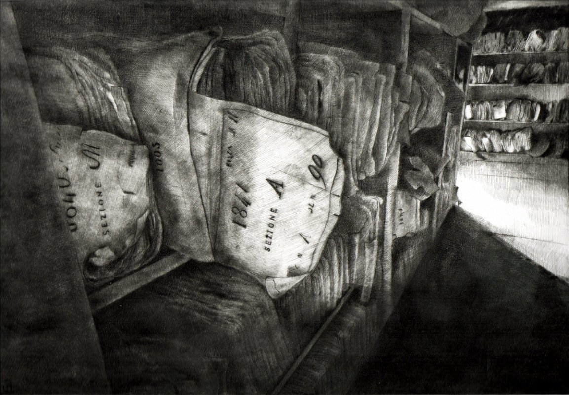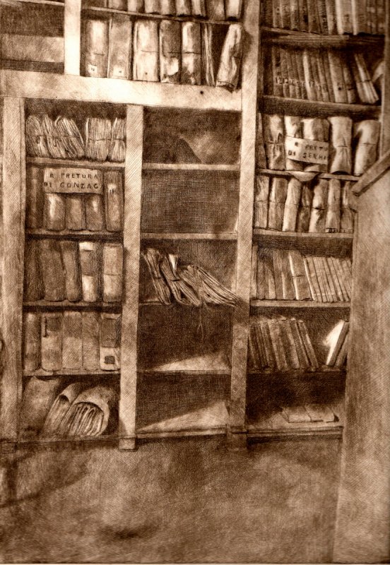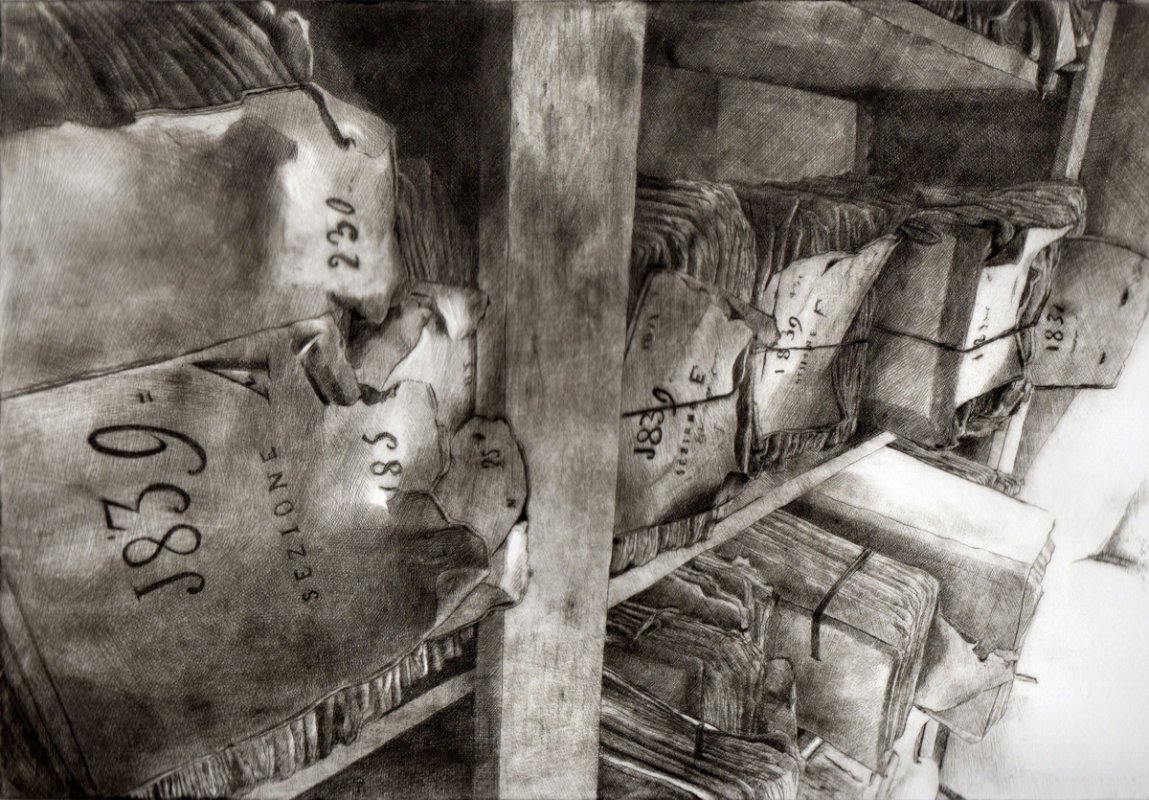 E' una mostra progettata pensata e realizzata come omaggio per l'Archivio di Stato, le motivazioni che mi hanno spinto a realizzare questa mostra sono strettamente personali. Sin dalla fine della Scuola di Archivistica, ho sentito di avere un debito di riconoscenza per questo Ente e per il personale, per l'importanza che ha avuto nel processo di maturazione e decisione definitiva della mia scelta di vita. Sono passati diversi anni, ho atteso di avere le capacità tecniche e non solo, per poter realizzare un progetto organico come quello qui presentato, consono e all'altezza del luogo stupendo che qui raffiguro. La decisione e l'idea che fosse arrivato il momento giusto mi è venuta l'anno passato durante la mostra di incisione "Digitale e la puntasecca" in cui cercavo gli elementi pittorici della puntasecca. Nel luglio passato feci le foto all'interno dell'archivio giudiziario e da cui sono state tratte le incisioni. Foto che sono state esposte in anteprima, dal 16 marzo fino al 16 aprile 2016, in Sacrestia con il titolo "Ispirata dagli archivi". Lavoro che vede ora la sua fase conclusiva. Pensato come un viaggio virtuale che attraverso le incisioni conduce l'osservatore a conoscere i depositi ottocenteschi -dall'esterno su via Ardigò al suo interno fin dentro gli scaffali - e nello stesso tempo un viaggio semantico nella parola archivio, archivio come edificio - archivio come locale, e come complesso documentario.