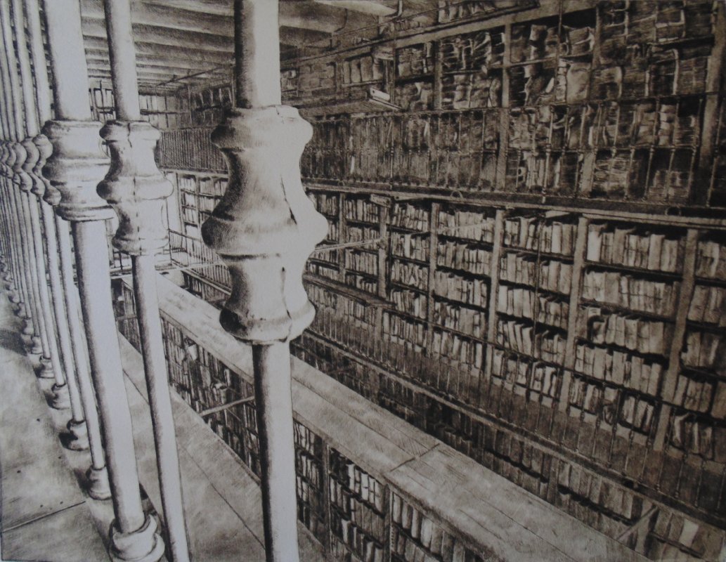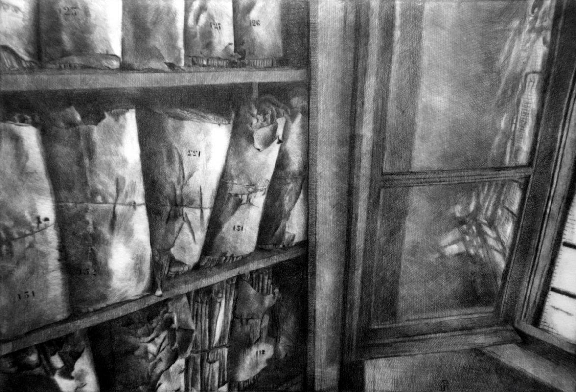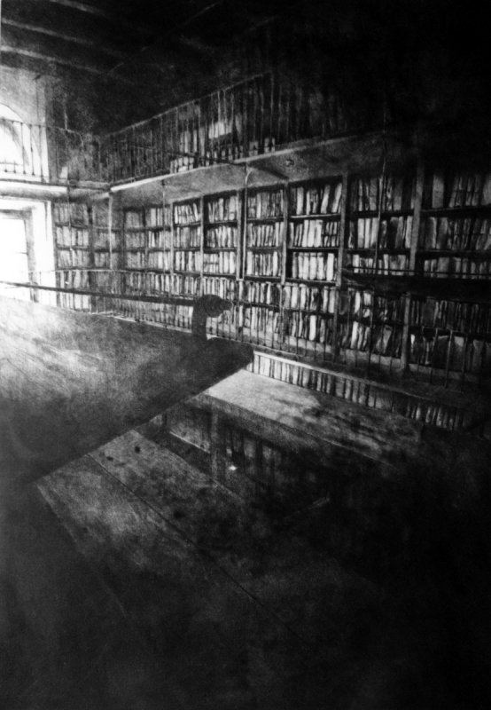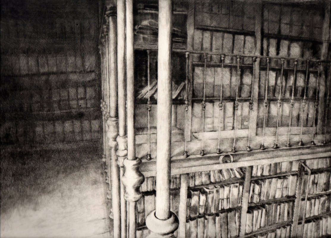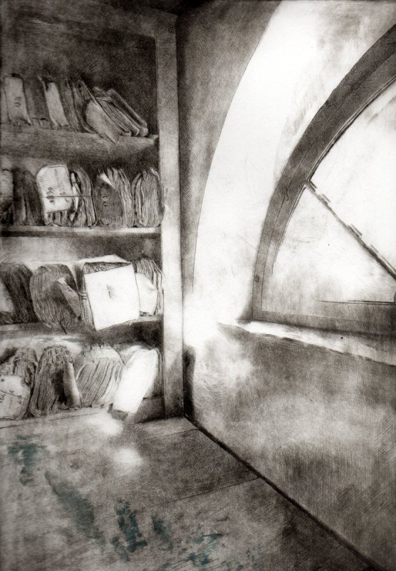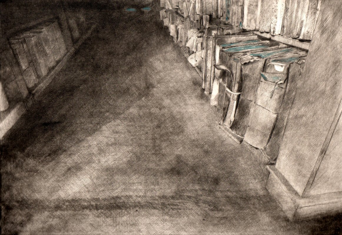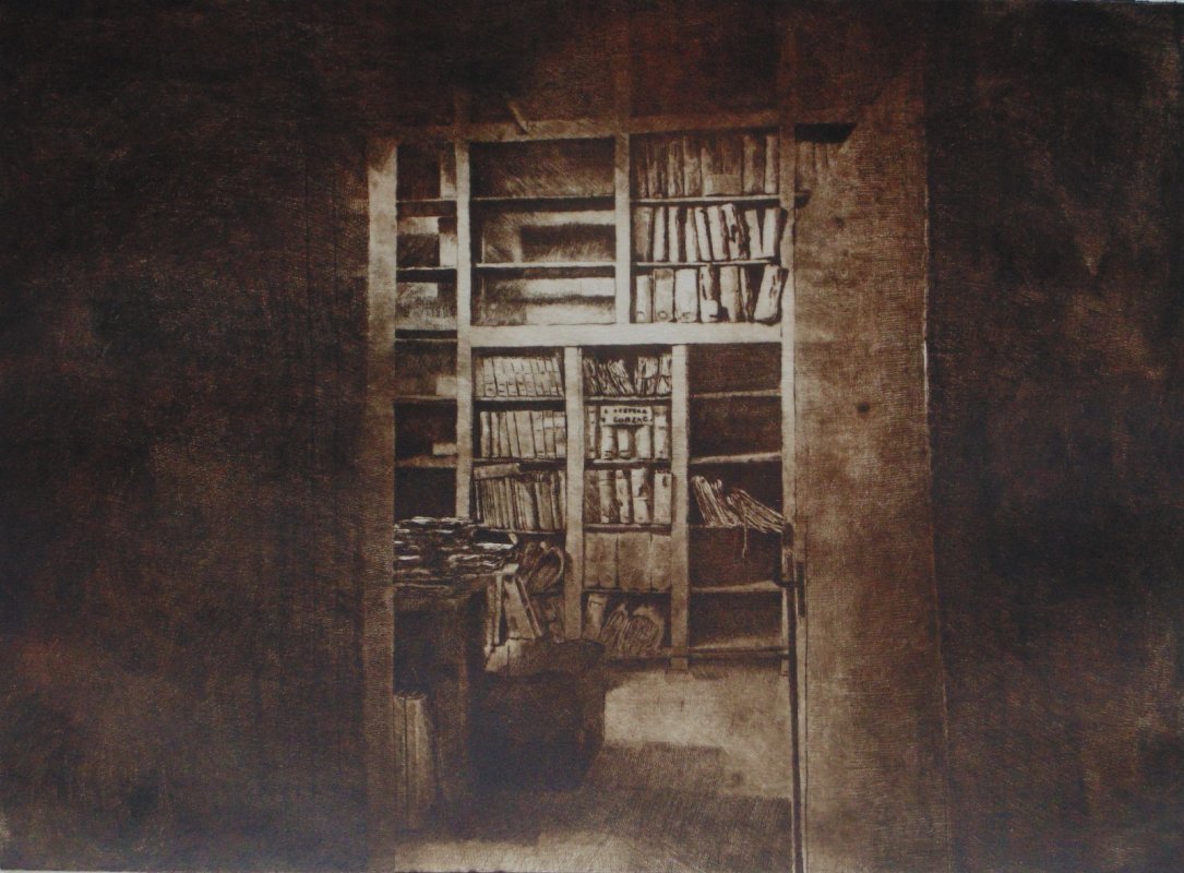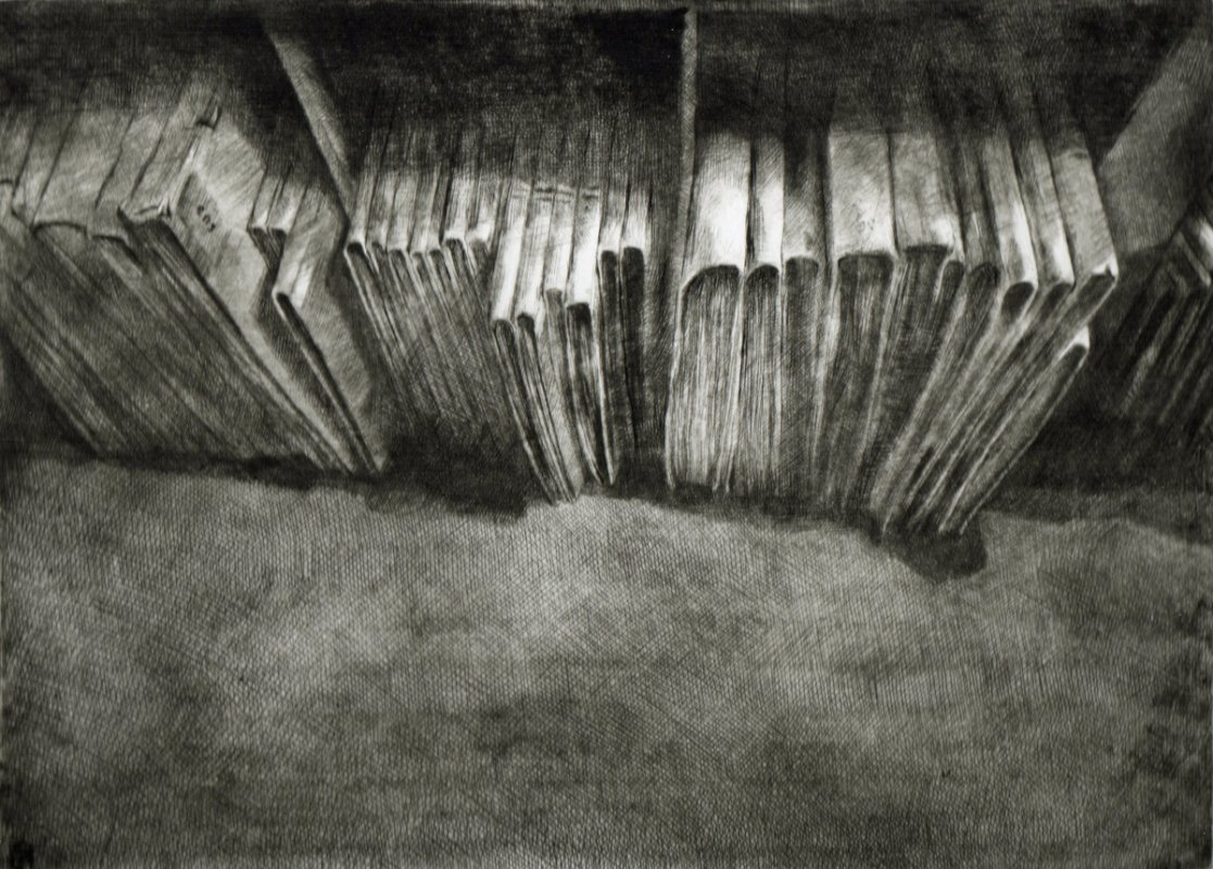 2016, Piano terra - scaffali, puntasecca su vetro sintetico 210 x 300 mm, carta Fabriano 35 x 50 cm