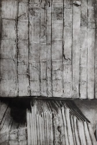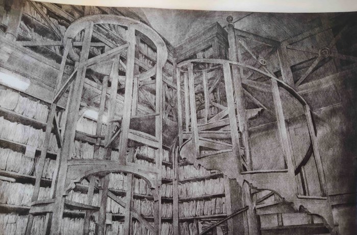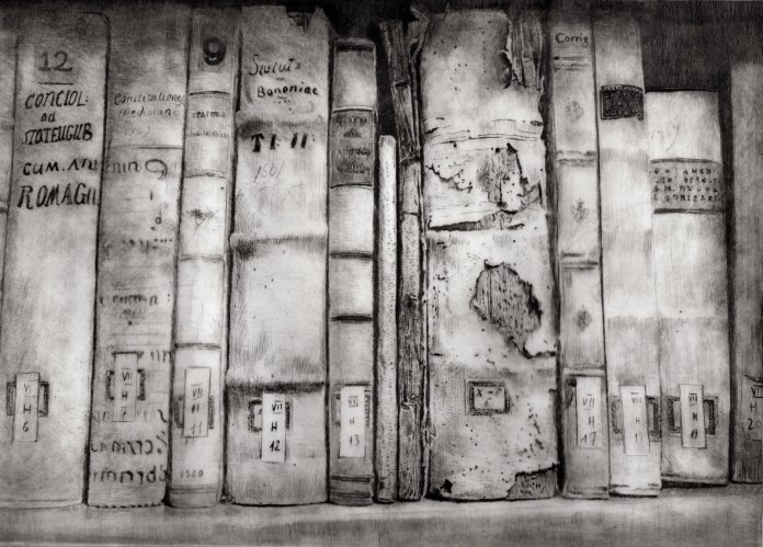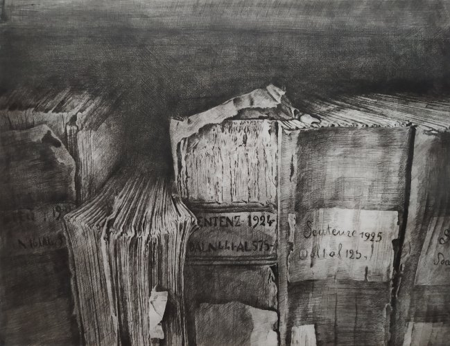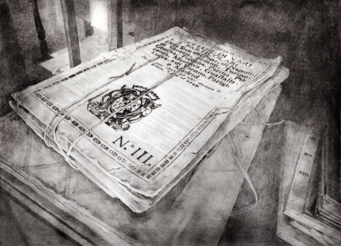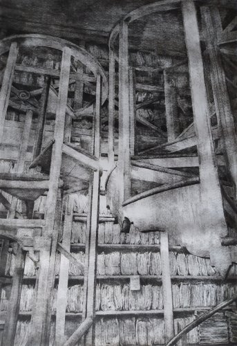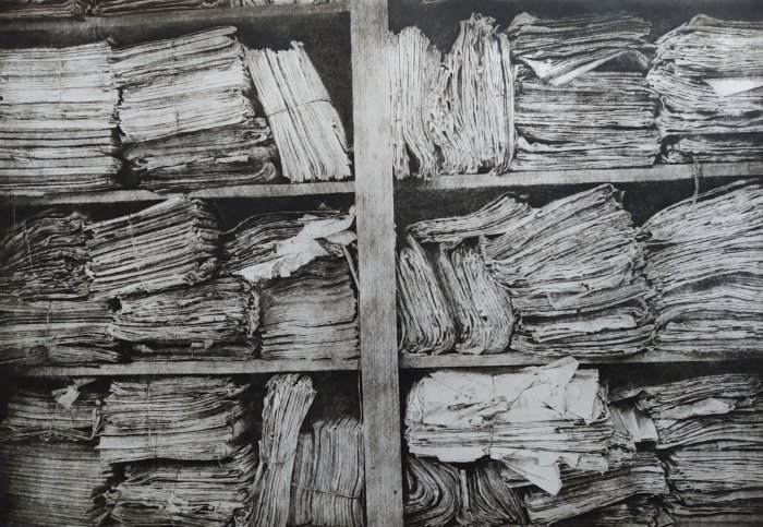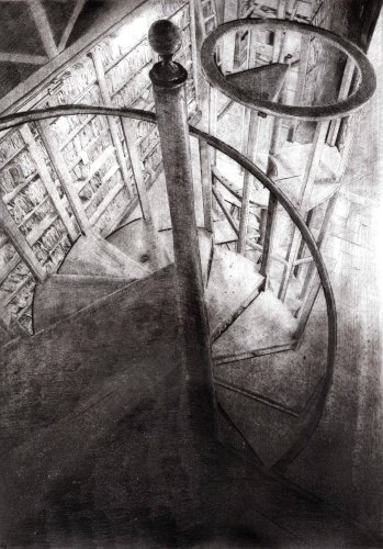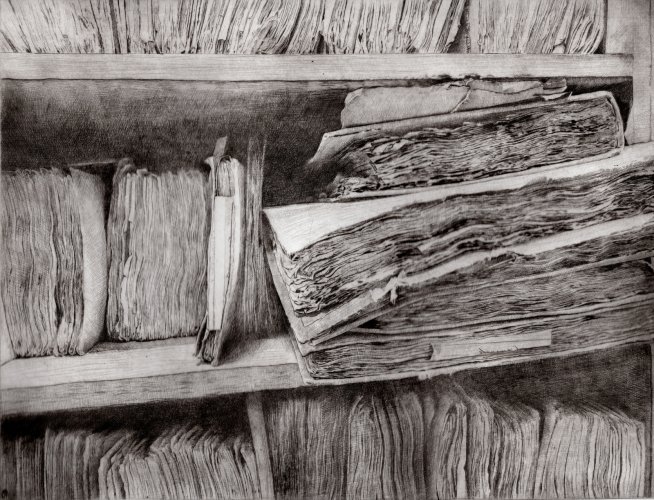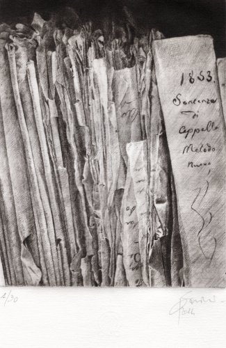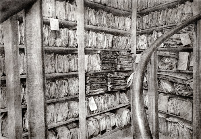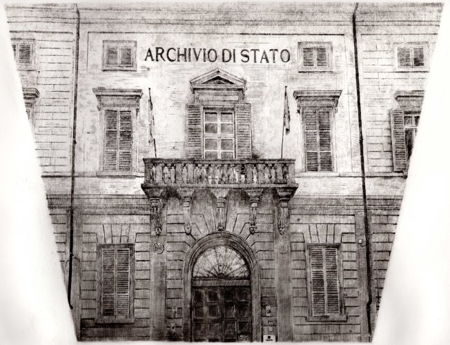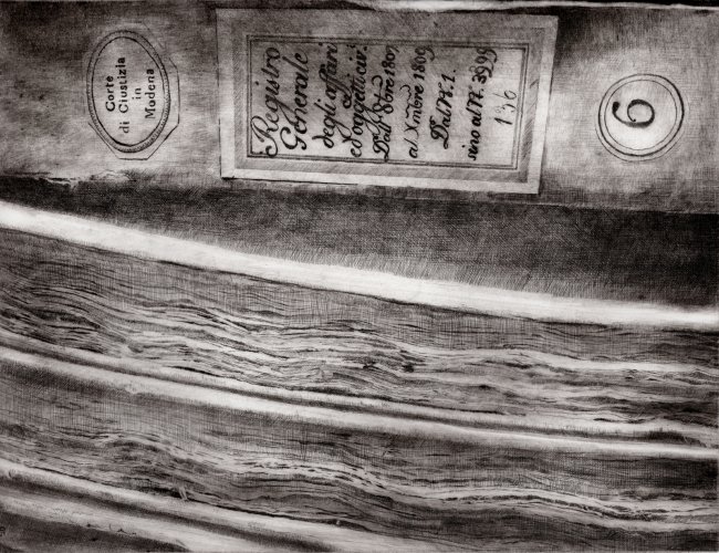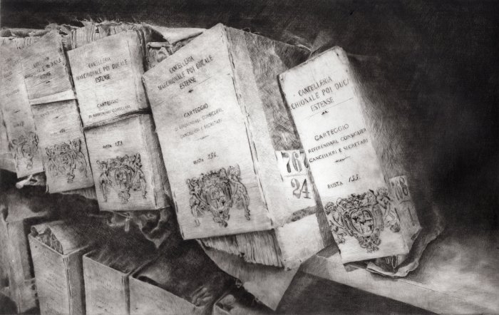 Il lavoro sottile, delicato e forte insieme che Daniela Savini ci consegna mediante le sue tavole su carta Fabriano e sono frutto di un laborioso processo di distillazione di immagini fotografiche scattate in un sito che è stato ed è luogo di studio, di formazione, di creazione artistica. L’Archivio di Stato di Mantova prima e ora l’Archivio di Stato di Modena sono i terreni privilegiati per dar forma di foglio in foglio alla reificazione dell’Archivio non solo come ufficio amministrativo statale quanto come edificio che esibisce, con la sua articolata membrana di scale, di accessi, di scaffali, di meandri la struttura portante dei fondi con le migliaia di carte sparse, di faldoni, di atti che svelano a chi sa leggerli i documenti della storia di una città, di un contado, di una provincia, di una famiglia.